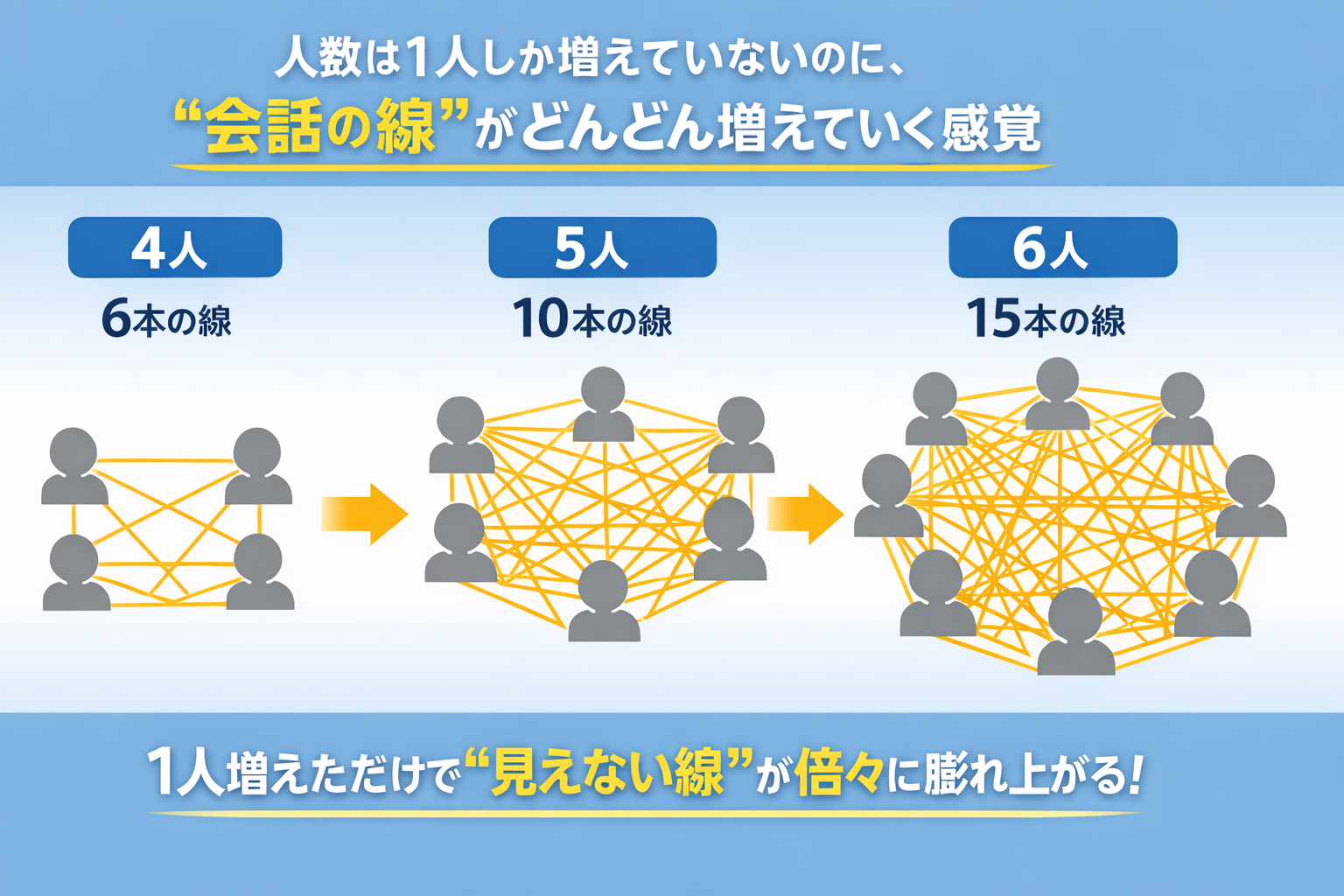 イメージとしては、人が増えるたびに会話の線がどんどん増えていく感覚です。