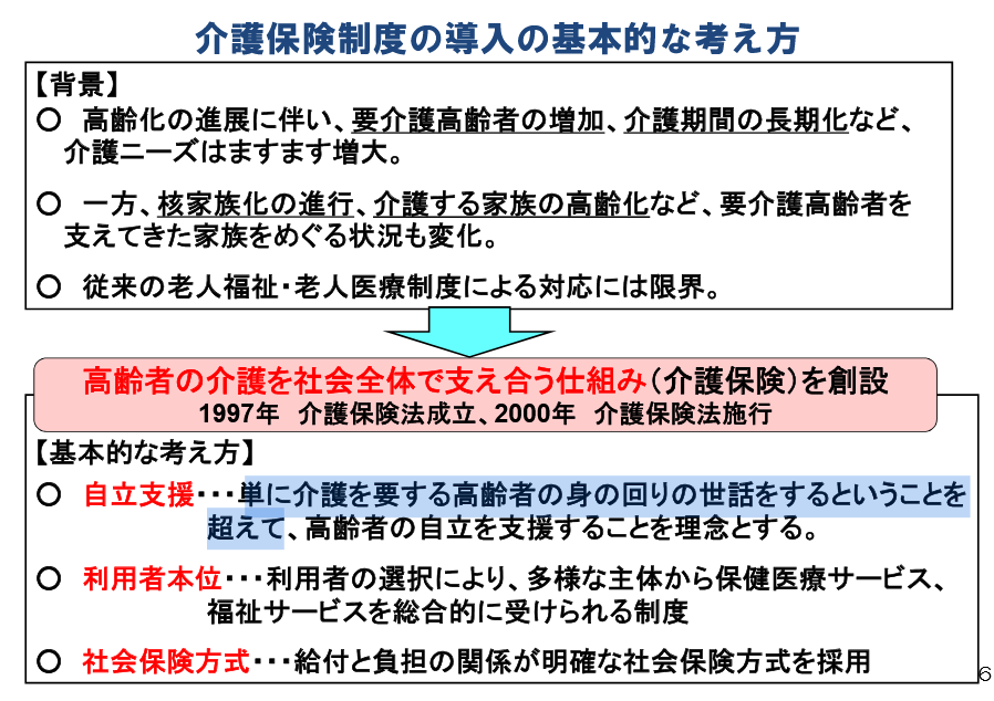 制度の根幹に据えられた理念は、「自立支援」「利用者本位」「社会保険方式」。