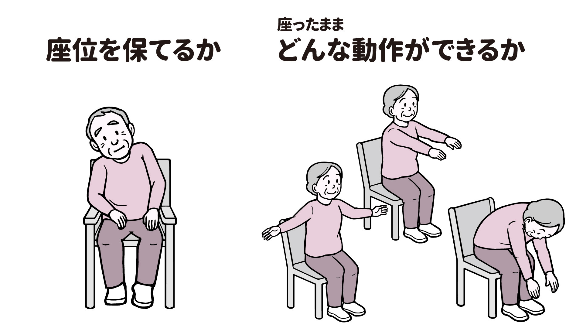 イスに座った状態で、両手を動かしたり体を動かしたりといった動作がどのくらい行えるかを確認します。