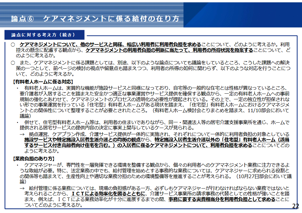 厚生労働省は、これまで利用者負担ゼロだったケアマネジメントについて、住宅型有料老人ホーム(住宅型)・サービス付き高齢者向け住宅(サ高住)を対象とした「一部有料化」の最終調整に入りました。