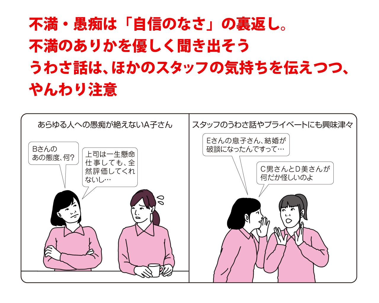 管理者が相手を否定せず、丁寧に不満の背景を聴き取り、その内容を職場改善へつなげることが、介護現場のチームマネジメントにおける重要な第一歩となる。