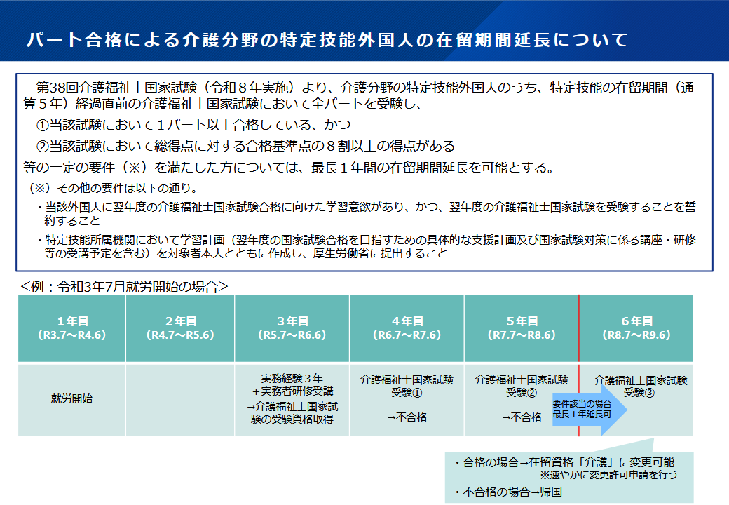特定技能1号で働く外国人介護人材について、一定の条件を満たした場合、在留期間の上限である「5年」を超えて日本に滞在し、翌年度の介護福祉士国家試験を再受験できる特例措置を認めるというものです。