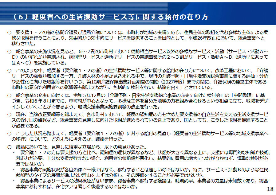 要介護1・2の訪問介護・通所介護を市町村の総合事業へ移管する案については、2027年度改正での実施を見送る方針が示されました。