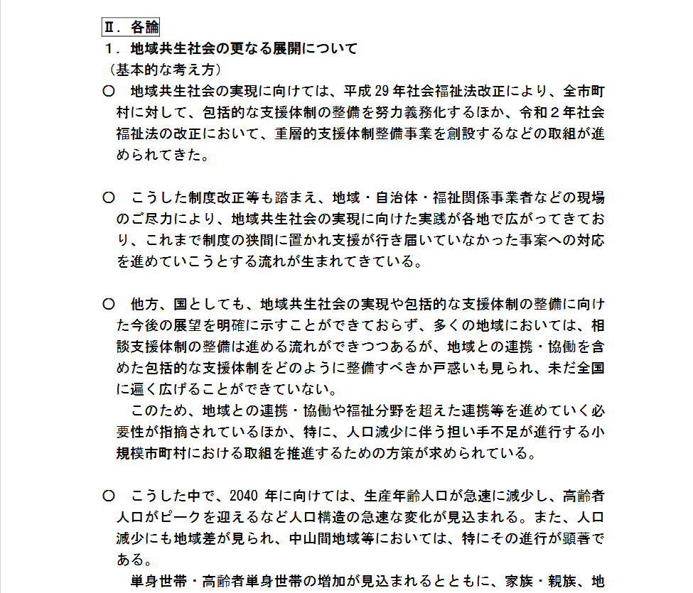 報告書の締めくくりでは、社会福祉法制定時からの社会構造の変化に触れながら、「制度だけでは支えきれない時代」における地域づくりの重要性が改めて示されました。
