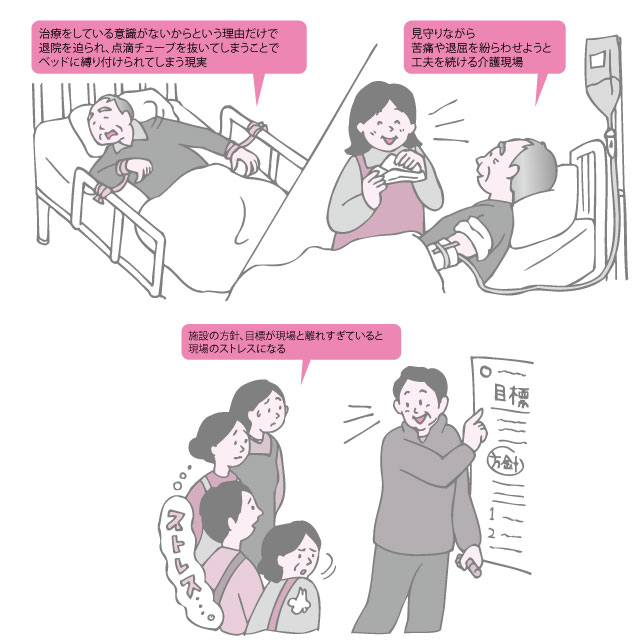 チューブを抜いてしまうからと退院を迫られ、あるいは身体拘束が選択されてしまう。