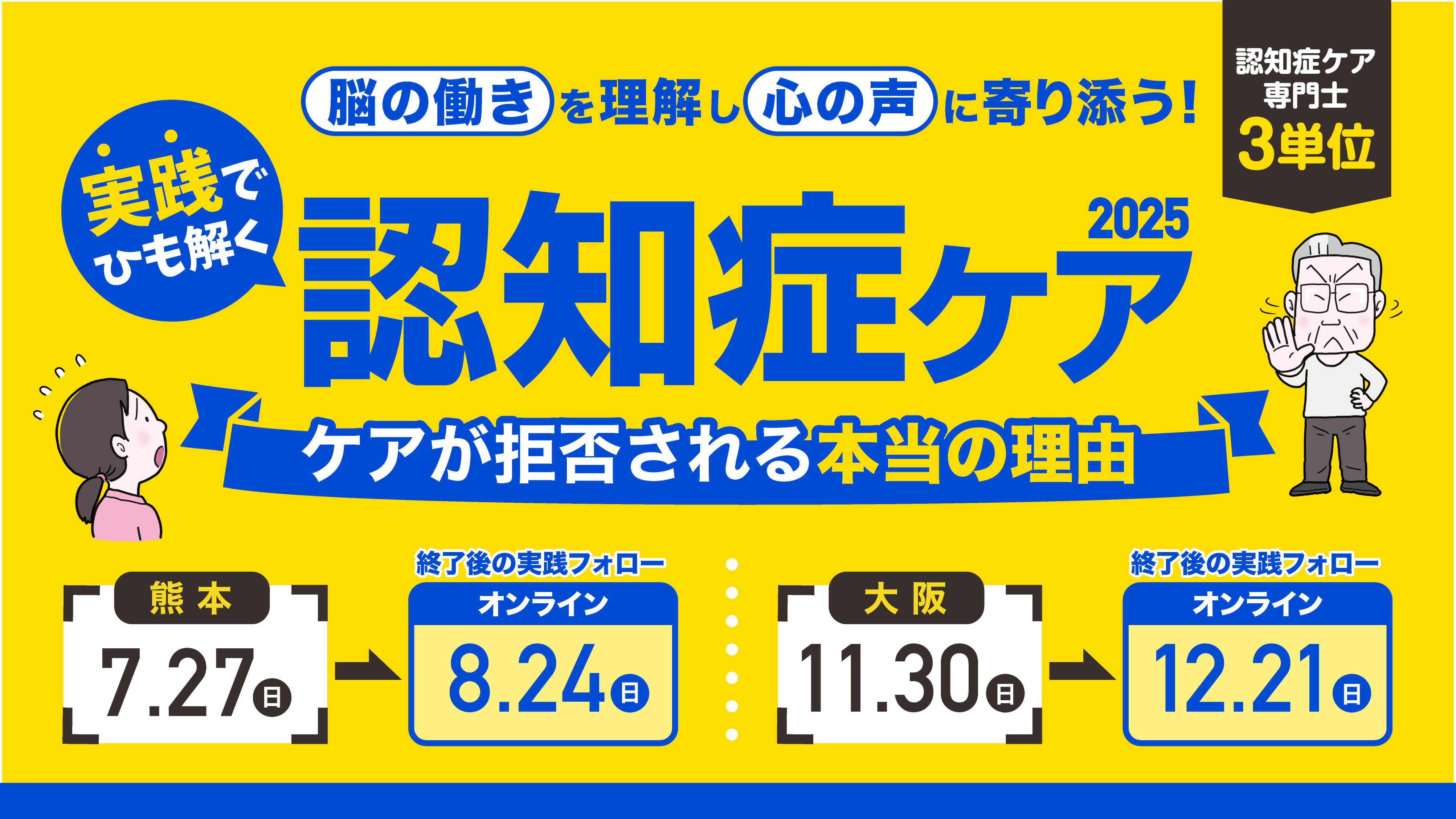 本セミナーでは、こうした場面で求められる「認知症のある方の行動や反応の背景を脳機能から理解する視点」と「その人の心情に寄り添った実践的な対応方法」について、理論と技術の両面から学びを深めていただき、多職種の専門性を活かしながら、認知症ケアにおける「理解」と「実践」を有機的に結びつけることを目的としています。